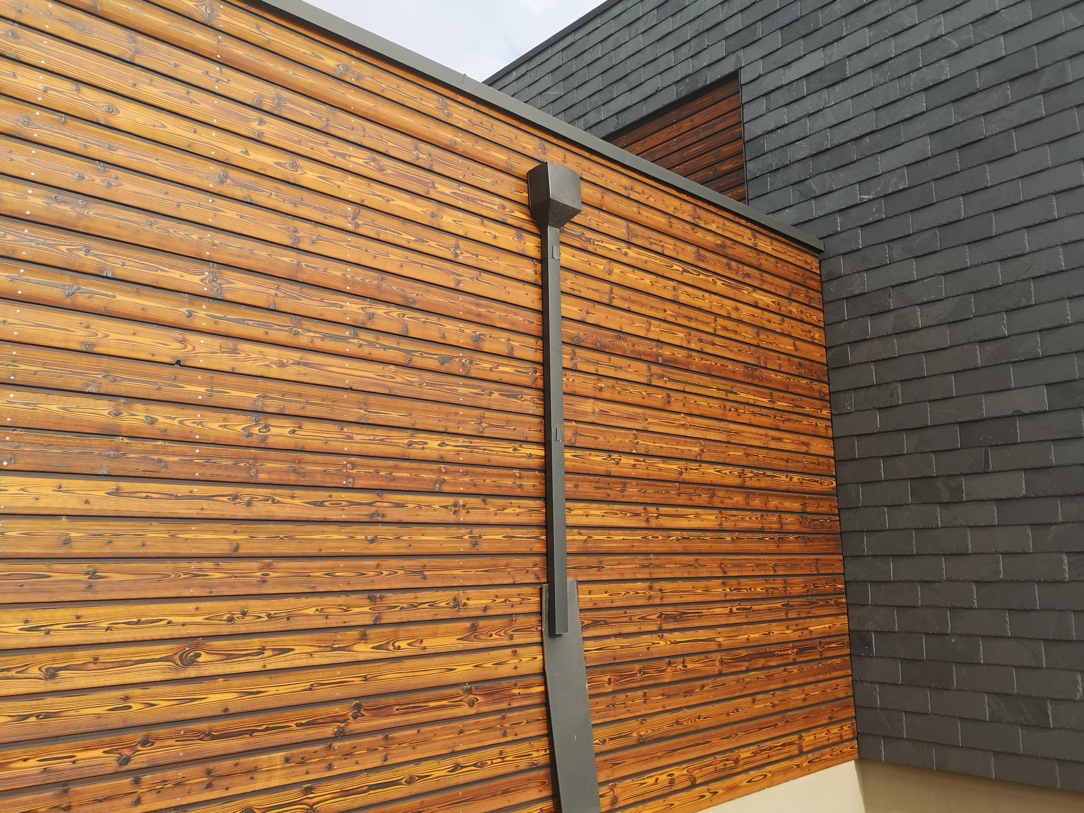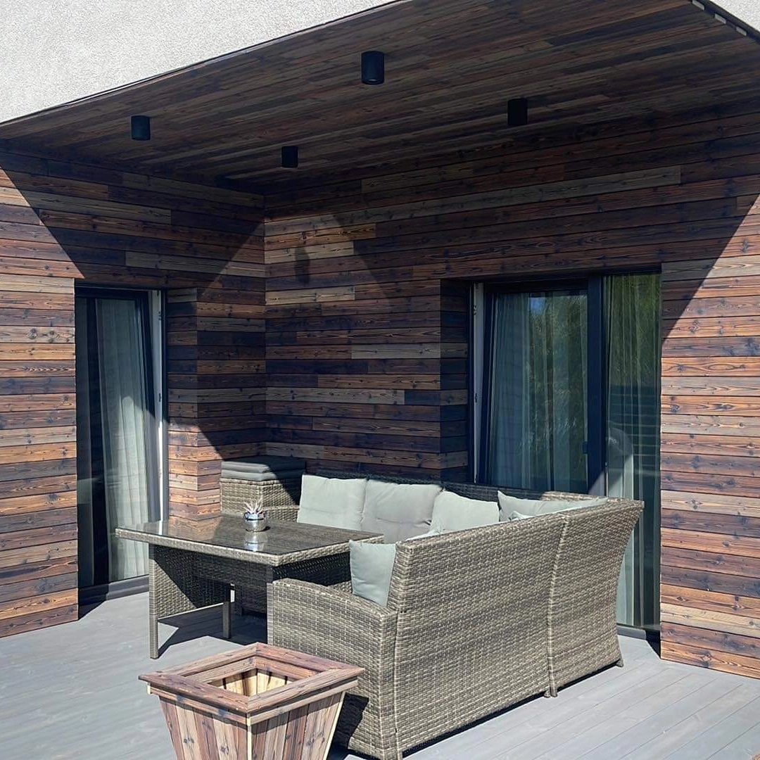 Atminkite, kad deginta mediena laikui bėgant gali šiek tiek keisti spalvą. Iš pradžių ji gali būti ryškiai ruda, tačiau veikiant saulei ir drėgmei, įgaus sodresnę, patinuotą išvaizdą. Šis spalvos pokytis yra natūralus procesas ir yra laikomas degintos medienos fasado grožio dalimi.